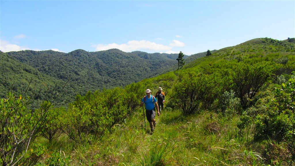 Bem cedinho, com o sol a pino, descemos o Pico do Itapeva para entrar na trilha. A ventania aumentava com o passar das horas, deixando o céu parcialmente nublado. À tarde, com nuvens escuras sobre o Pico do Diamante, iniciamos o retorno. Um percurso de 16 km em 6 horas de caminhada.