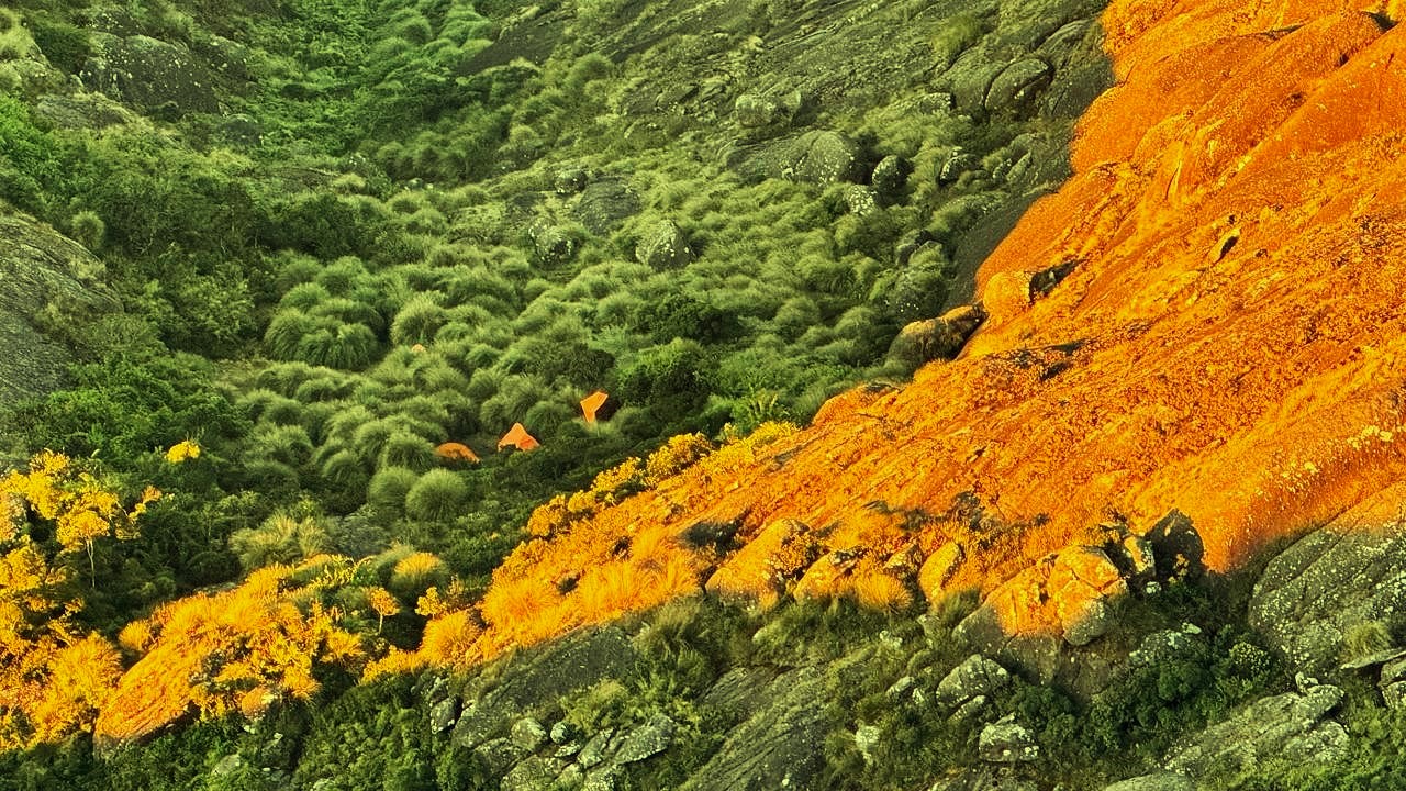 O pôr do sol na montanha foi um dos pontos altos — como um fogo sobre a terra, a luz intensa se refletiu nas formações rochosas, enquanto o verde escuro dos arbustos se espalhava pelas grotas e vales profundos. Do nosso acampamento, a paisagem quase se perdia nas sombras da vegetação. Uma visão extraordinária e singular nas terras altas da Mantiqueira.