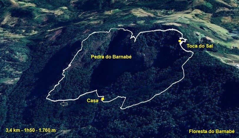 Em terras do sul de Minas, nada é plano. Então, ao subir qualquer morro ou pedra, o desnível será no mínimo uma centena de metros. Na Pedra do Barnabé atingimos 1.700 m na torre de transmissão, descemos a 1.660 m na transição de uma pedra para outra, atingimos o ponto mais alto a 1.760 m na segunda pedra e retornamos ao início a 1.530 m de altitude.